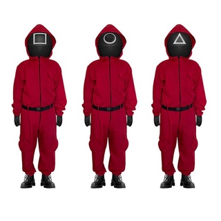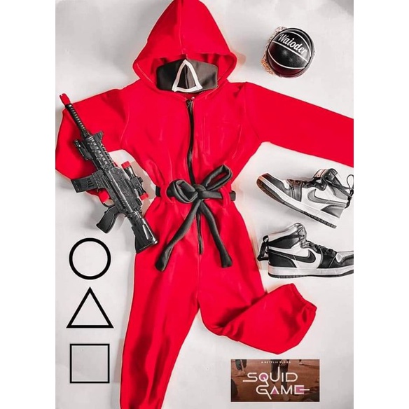 If you encounter any problems please consult us. They wear a hooded red jumpsuit and black masks printed with different shapes. Yup Squid Game outfits other merchandises are on sale at very affordable prices.